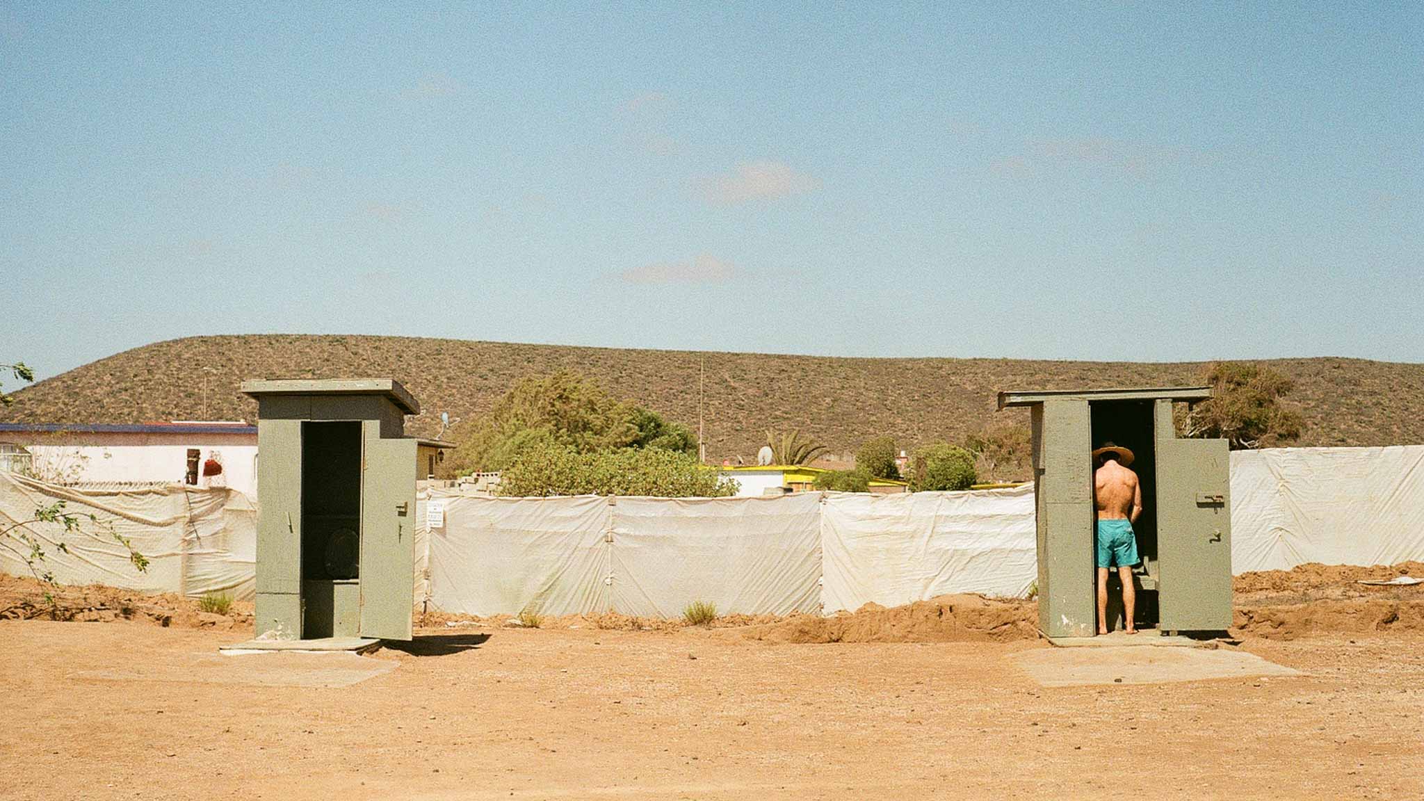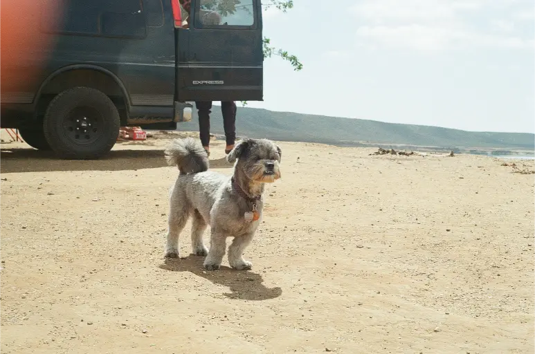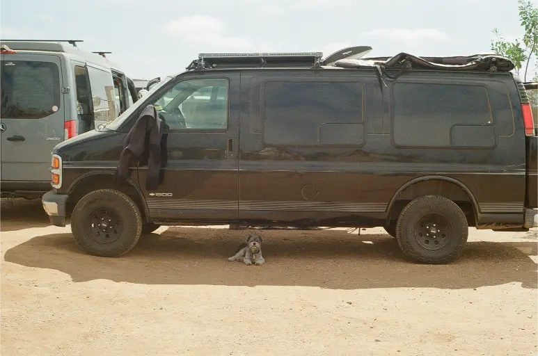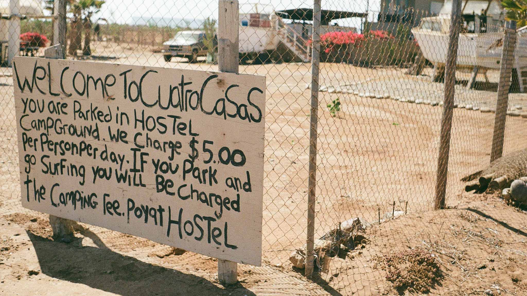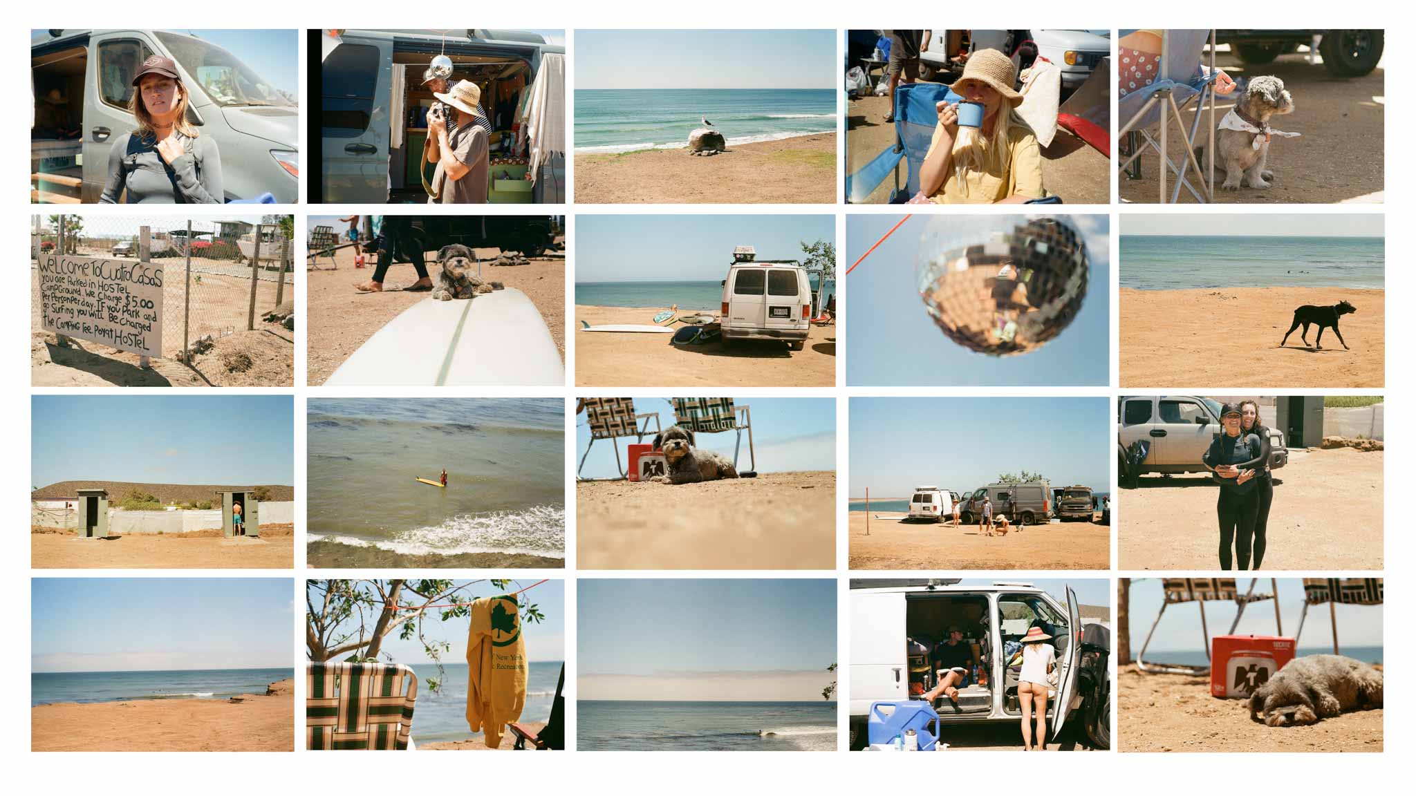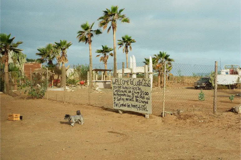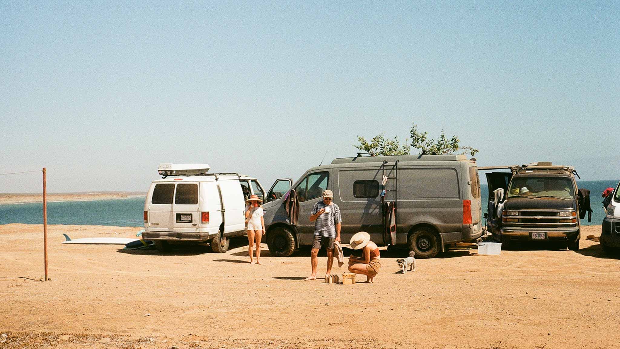 Luckily, friends Chandra and Chimay had not crossed the border yet and had space for Chewie and me. Chewie never misses a road trip. For some unknown reason (perhaps to not take up too much space in their van?), I chose to leave all my cameras behind, except for my trusty 35mm, a few rolls of film, and an unknowingly dead battery. We crossed the border, drove a few hours south down Highway Mexico 1D, took a right, drove another hour down the dirt road, and finally, we arrived at the crew's campsite way past Baja midnight; it was 9pm.